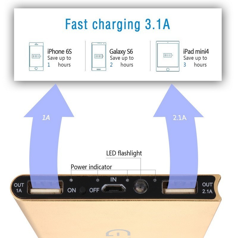 কাস্টম লোগো সহ সমস্ত ছোট ফোনগুলির জন্য অ্যালুমিনিয়াম 10000mAh ডুয়াল ইউএসবি মোবাইল পাওয়ার ব্যাংক