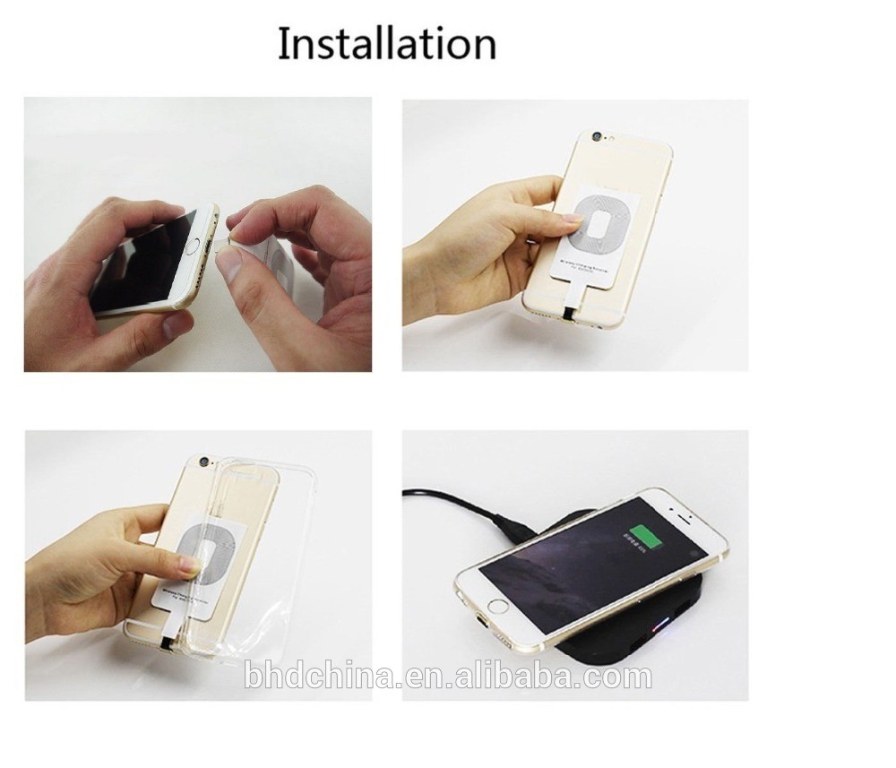 4. Łatwy w obsłudze: zdejmij tylną obudowę telefonu - przyklej podkładkę odbiornika do baterii telefonu - zamknij tylną obudowę - umieść telefon komórkowy na podkładce do ładowania bezprzewodowego (brak w zestawie).